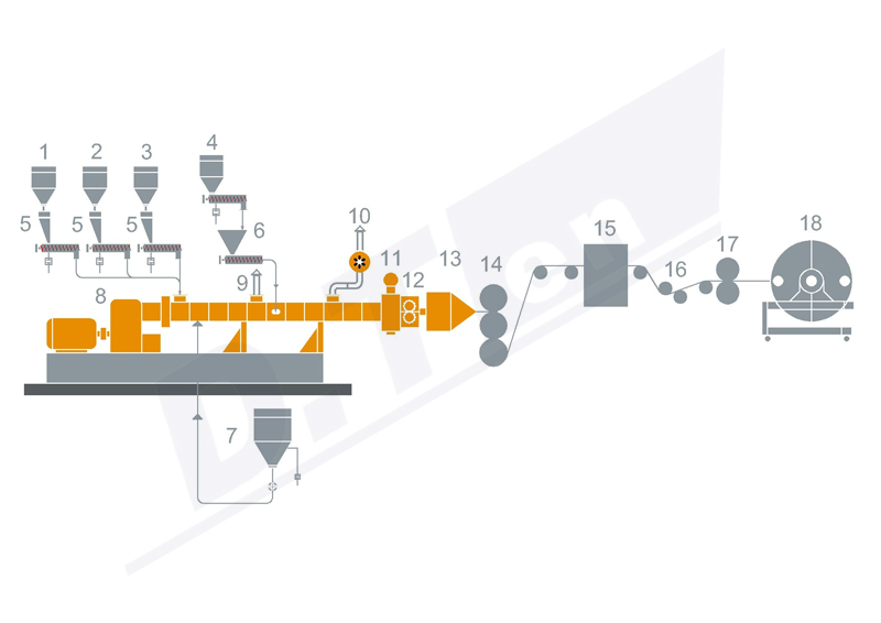 1. 聚合物 2. 助劑 3. 填充1 4. 填充2(可選) 5. 失重式喂料機 6. 側(cè)向式喂料機 7. 液體喂料機(可選) 8. 雙螺桿擠出機 9. 自然排氣 10. 強制真空排氣 11. 開車閥 12. 熔體泵 13. 擠出模頭 14. 三輥壓延 15. 測厚裝置 16. 裁邊裝置 17. 牽引裝置 18. 收卷裝置 |